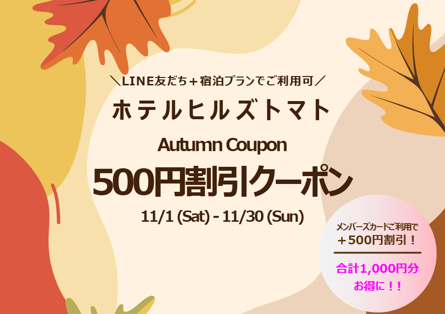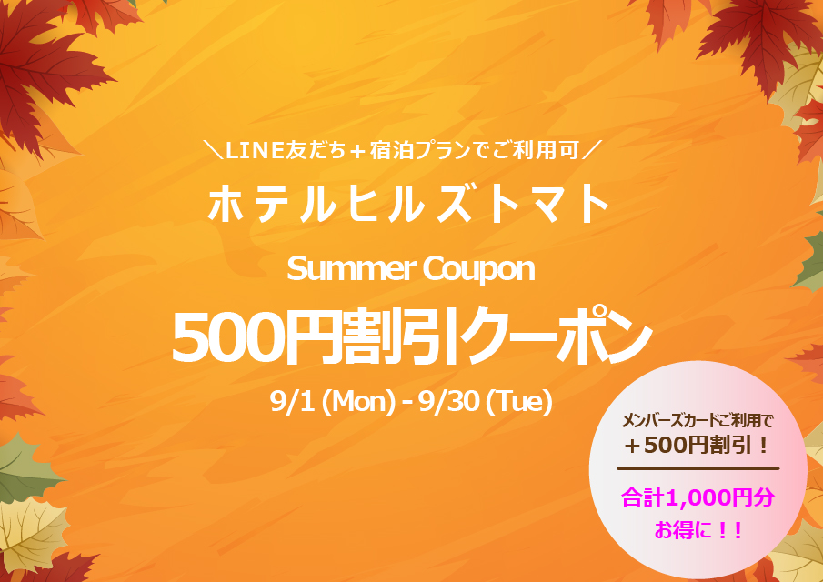 ホテル ヒルズトマト 2025/11/30 【ヒルズトマト】12月キャンペーンのお知らせ ヒルズトマト12月キャンペーン情報! LINE友達限定★宿泊プラン限定クーポンをご用意いたしました! 12月1日(月)~12月3...