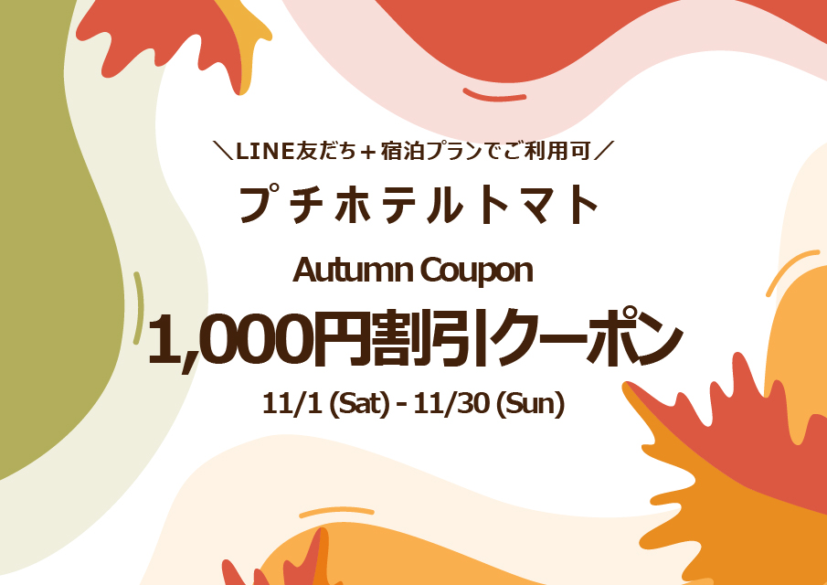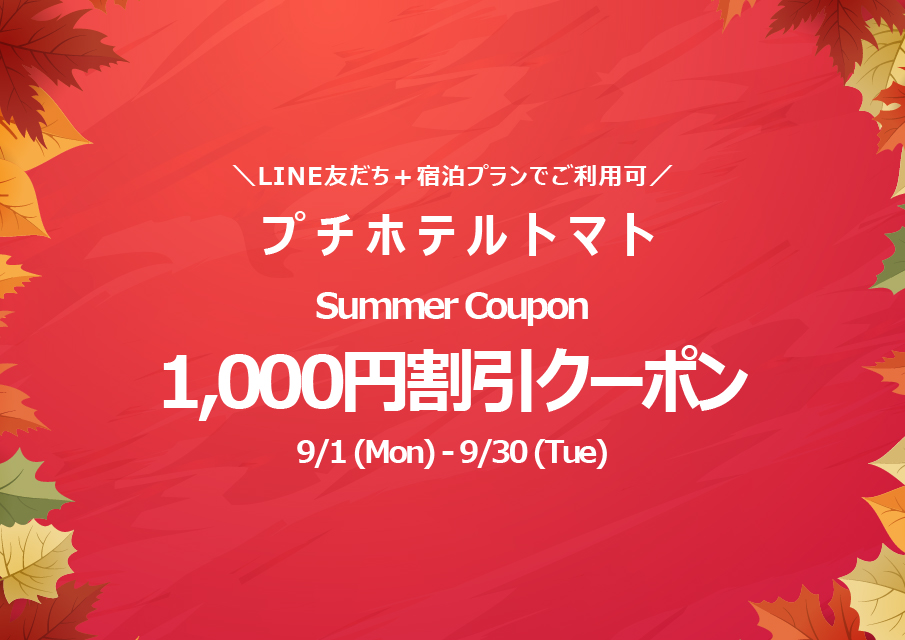 プチホテル トマト(長岡) 2025/11/30 【プチホテルトマト】12月キャンペーンのお知らせ プチホテルトマト12月キャンペーン情報! LINE友達限定★宿泊プラン限定クーポンをご用意いたしました! 12月1日(月)~12...