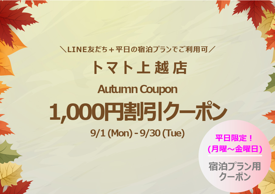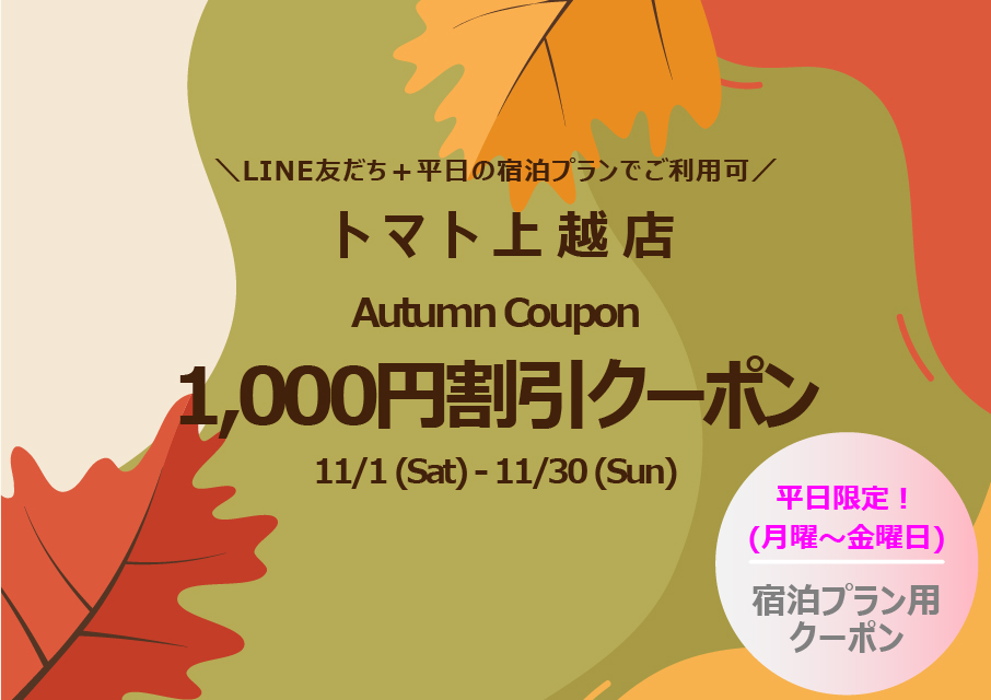 トマト上越店(ラブトマト) 2025/11/30 【トマト上越】12月キャンペーンのお知らせ トマト上越の12月キャンペーン情報! LINE友達限定★平日限定!宿泊プラン限定クーポンをご用意いたしました! 12月1日(月)...